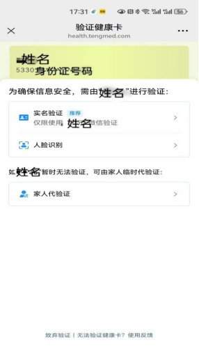 3.在“授权健康卡”环节点击“同意”,验证健康卡时选择“实名认证”(若为他人代办,需选择“家人代验证”);